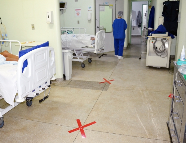 A UTI já foi demarcada para manter o distanciamento correto em relação aos leitos de pacientes que não estão em isolamento. As outras unidades de internação receberão as marcações necessárias.