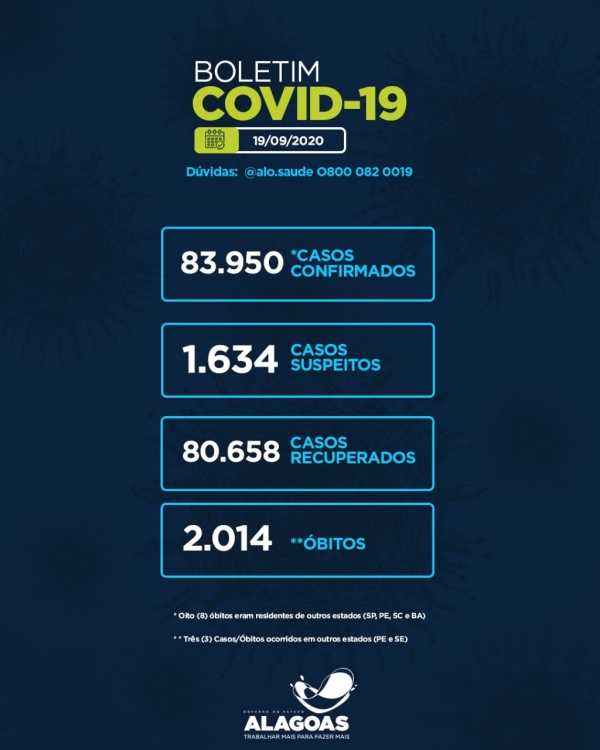 Os casos confirmados de pessoas com a Covid-19 estão distribuídos nos 102 municípios alagoanos. Em relação ao quadro total de óbitos em Alagoas, estão confirmados 2.014 óbitos por Covid-19, mas, oito deles, eram de pessoas residentes em Pernambuco, São Paulo, Santa Catarina e Bahia, tendo como vítimas seis homens e duas mulheres. Dos 2.006 óbitos de pessoas residentes em Alagoas, 1.129 eram do sexo masculino e 877 do sexo feminino. Eram 931 pessoas que residiam em Maceió e as outras 1.075 moravam no interior do Estado, segundo o Centro de Informações Estratégicas de Vigilância em Saúde (Cievs), da Sesau.