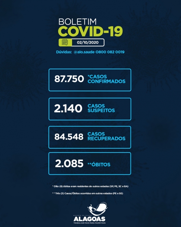 Óbitos – No boletim desta sexta-feira (02/10), mais sete mortes foram confirmadas, laboratorialmente, por causa do novo coronavírus. Três vítimas eram residentes em Maceió, sendo um homem e duas mulheres. O homem de 59 anos não tinha registro de comorbidades e faleceu no Hospital da Mulher; a mulher de 63 anos era cardiopata e faleceu no Hospital Arthur Ramos; e a vítima de 65 anos era diabética e faleceu na UPA Trapiche.